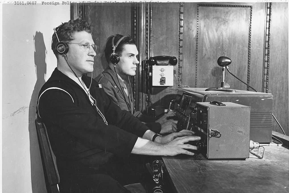 The picture shows two American technicians operating the “Interpreting Device” in the courtroom.